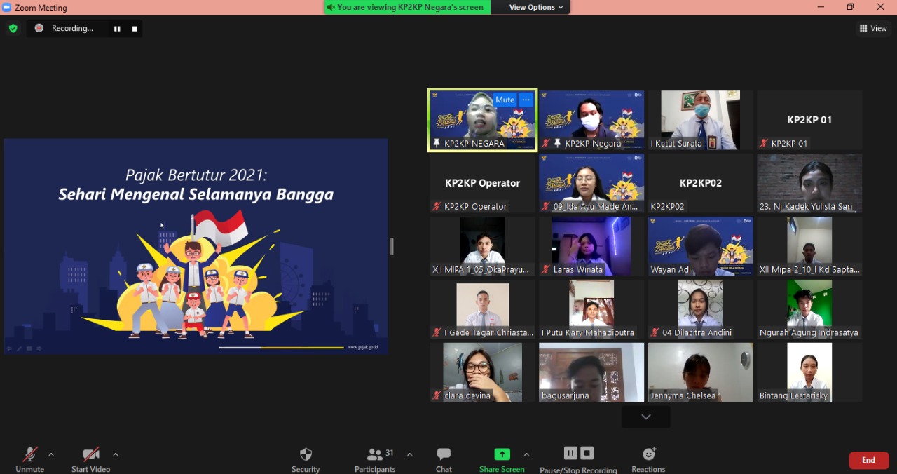 Kantor Pelayanan, Penyuluhan, dan Konsultasi Perpajakan (KP2KP) Negara mengadakan Pajak Bertutur 2021 “ Sehari Mengenal, Selamanya Bangga” secara daring bersama 30 siswa-siswi SMA Negeri 1 Negara di Kabupaten Jembrana, Bali (Rabu, 25/08).