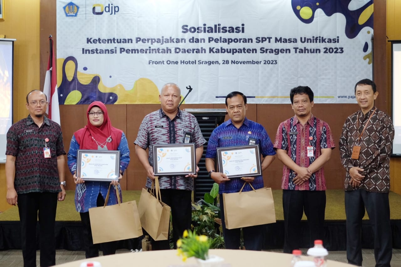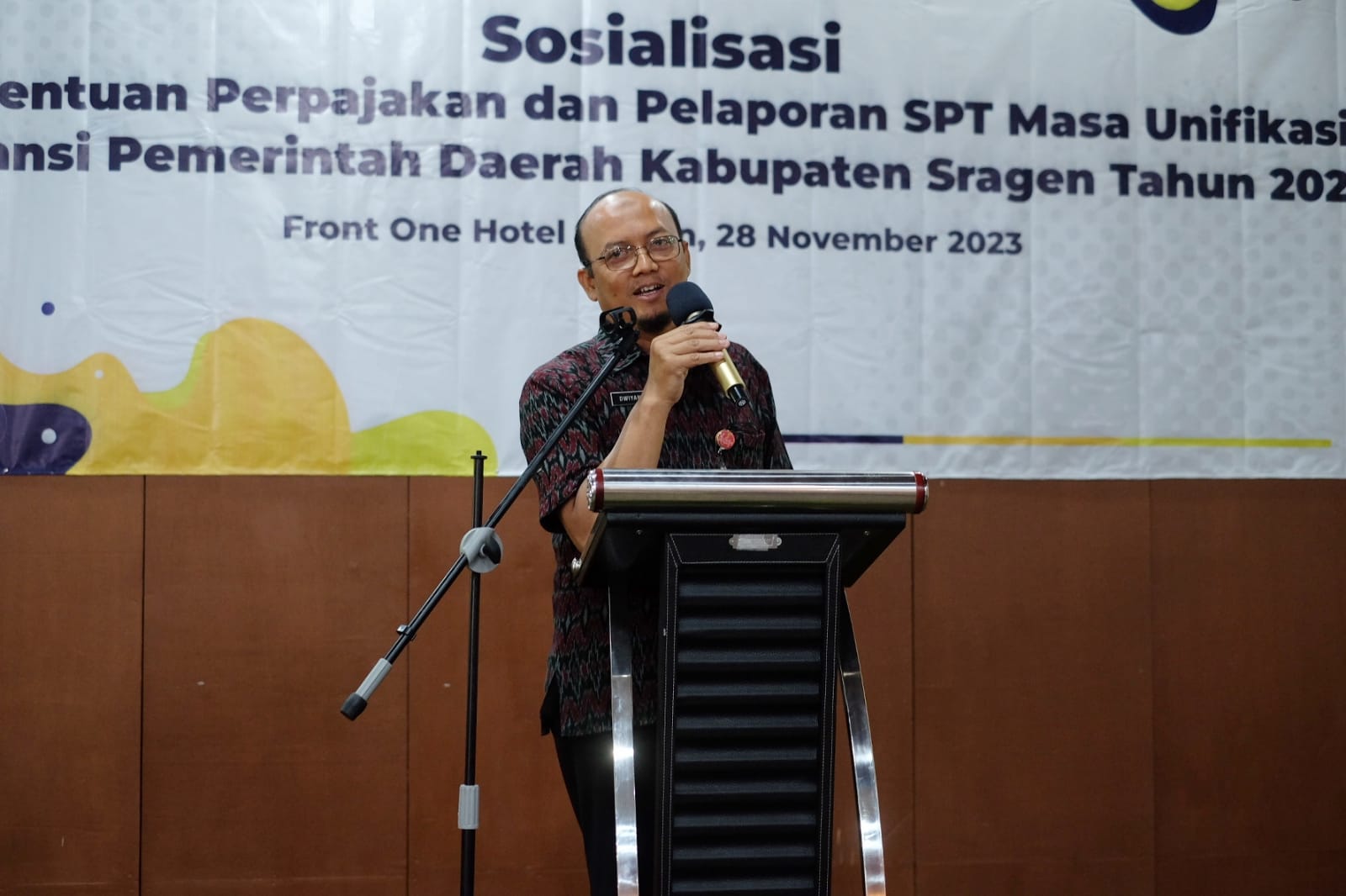 Kantor Pelayanan Pajak (KPP) Pratama Karanganyar dan Kantor Pelayanan Penyuluhan dan Konsultasi Perpajakan (KP2KP) Sragen mengadakan Sosialisasi Ketentuan Perpajakan dan Pelaporan SPT Masa Unifikasi Instansi Pemerintah Daerah di Front One Hotel Sragen, Kabupaten Sragen (Selasa, 28/11).