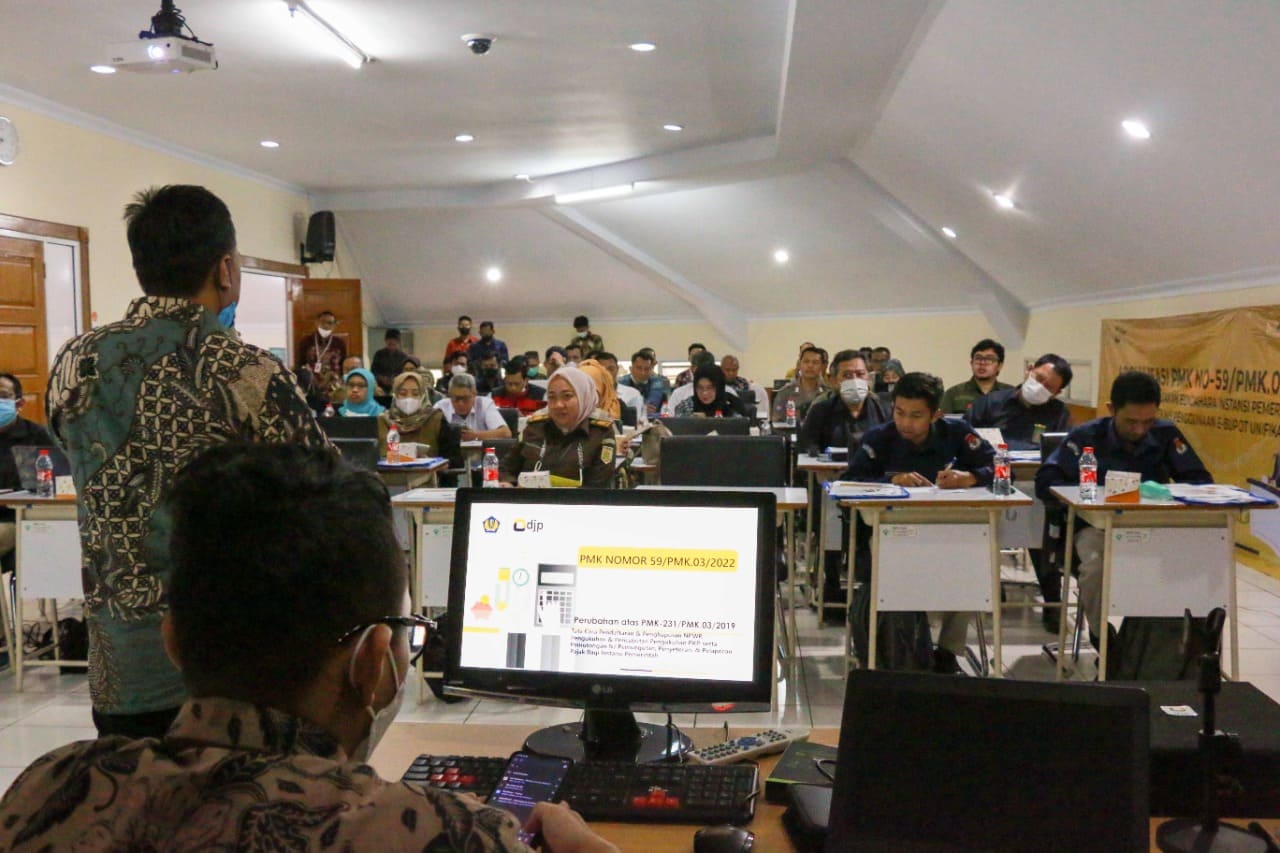 Kantor Pelayanan Pajak (KPP) Pratama Cianjur bekerja sama dengan Balai Besar Pelatihan Kesehatan (BBPK) Ciloto kembali memberikan bimbingan teknis tentang penerapan Peraturan Menteri Keuangan (PMK) Nomor 58/PMK.03/2022, PMK Nomor 59/PMK.03/2022, dan penggunaan aplikasi e-Bupot unifikasi kepada bendahara satuan kerja (satker) pusat di wilayah Kabupaten Cianjur (Selasa, 13/9).