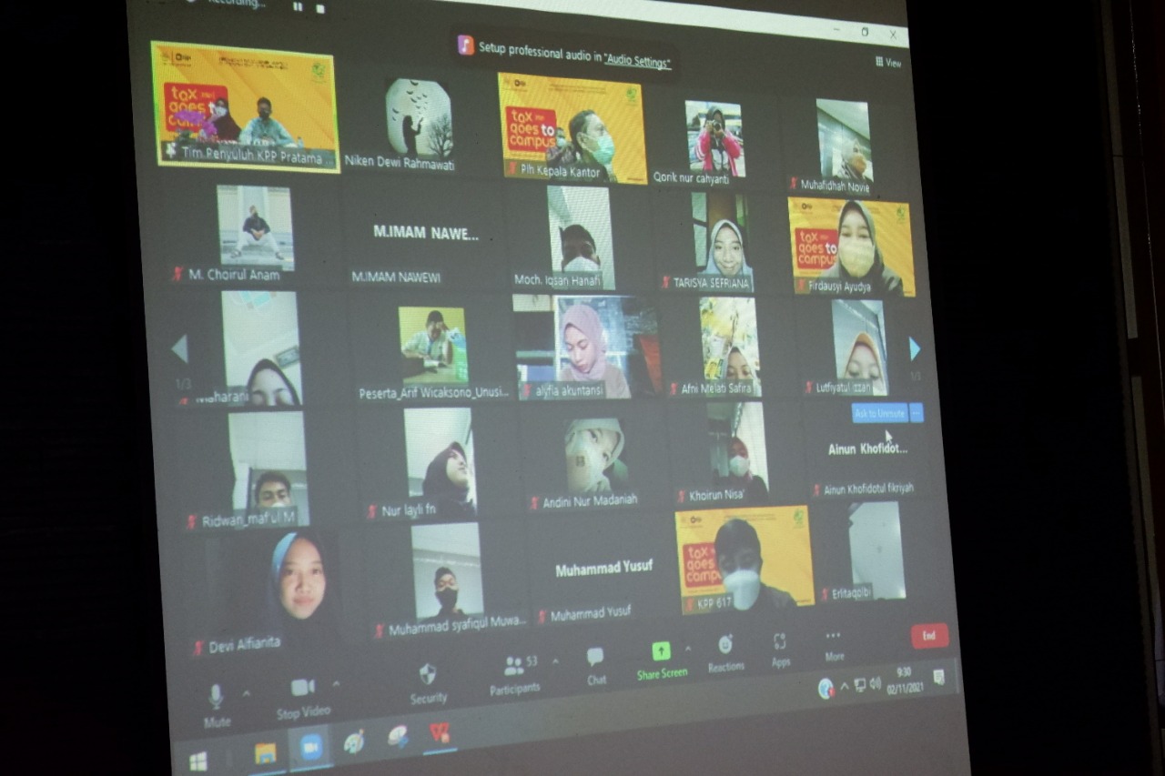 Kantor Pelayanan Pajak (KPP) Pratama Sidoarjo Selatan kembali mengadakan kegiatan Tax Goes To Campus (TGTC) bersama Universitas Nahdlatul Ulama Sidoarjo (UNUSIDA) dengan tema Kiprah Mahasiswa dalam Meningkatkan Voluntary Tax Compliance di Era Pandemi. Kegiatan dilaksanakan secara daring melalui Zoom Meeting di Sidoarjo dan diikuti oleh 53 mahasiswa UNUSIDA (Selasa, 02/11).