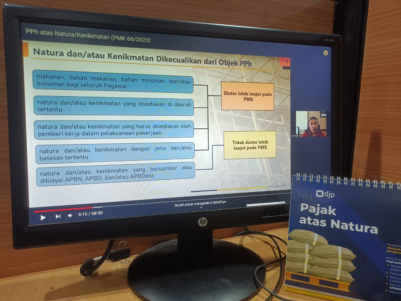 Kantor Pelayanan Pajak (KPP) Pratama Cibinong selenggarakan kelas pajak tentang perlakukan pajak penghasilan (PPh) sehubungan dengan natura dan/atau kenikmatan secara daring (Selasa, 25/7). Kelas pajak yang diikuti oleh 55 wajib pajak ini diadakan untuk menyampaikan aturan terbaru terkait dengan PPh natura sebagaimana diatur dalam Peraturan Menteri Keuangan (PMK) Nomor 66/PMK.03/2023 yang terbit tanggal 27 Juni 2023.