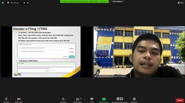 Sebanyak 60 mahasiswa calon relawan pajak dari Universitas Pelita Harapan (UPH) mengikuti pelatihan persiapan relawan pajak dengan materi tentang tata cara pengisian SPT Tahunan dan komunikasi efektif sebagai relawan pajak yang diberikan oleh Kantor Wilayah DJP Banten secara daring (Kamis, 25/2).