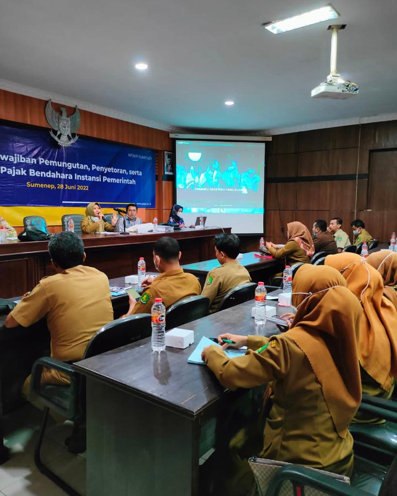 Kantor Pelayanan Pajak (KPP) Pratama Pamekasan bersama Kantor Pelayanan, Penyuluhan, dan Konsultasi Perpajakan (KP2KP) Sumenep mengundang 66 orang Bendahara Instansi Pemerintah Kab. Sumenep untuk mengikuti sosialisasi “Kewajiban Pemungutan, Penyetoran, serta Pelaporan Pajak Bendahara Instansi Pemerintah”. Kegiatan berlangsung mulai pukul 09.00 s.d. 12.00 WIB di Aula BPKAD Kab. Sumenep (Selasa, 28/06).