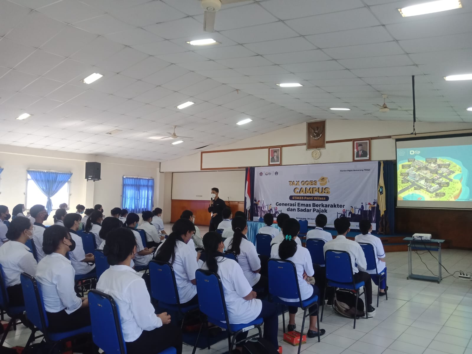 Kantor Pelayanan Pajak (KPP) Pratama Semarang Timur menyelenggarakan kegiatan Tax Goes To Campus (TGTC) yang diikuti oleh 66 mahasiswa beserta 12 dosen dengan tema “Generasi Emas Berkarakter dan Sadar Pajak” di aula lantai 4 Sekolah Tinggi Ilmu Kesehatan (STIKES) Panti Wilasa Kota Semarang (Senin, 20/6).