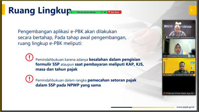 Pada kegiatan ini, Tim Penyuluh KPP Madya Banjarmasin dan Tim Penyuluh Kanwil DJP Kalselteng berkolaborasi dalam memberikan materi e-Pbk dan validasi NIK. Dalam penyampaian materi, Tim Penyuluh KPP Madya Banjarmasin menjelaskan tentang tata cara penyampaian permohonan pemindahbukuan secara elektronik melalui e-Pbk. Selanjutnya,vTim Penyuluh Kanwil DJP Kalselteng menjelaskan tentang validasi NIK dan NPWP melalui laman pajak.go.id.