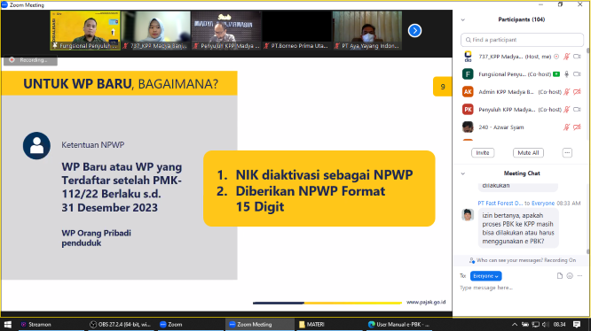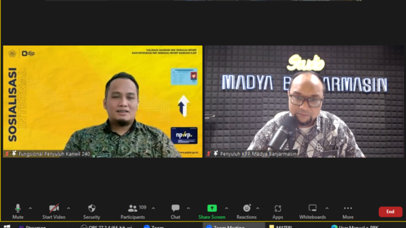Kantor Pelayanan Pajak (KPP) Madya Banjarmasin bersama Kantor Wilayah Direktorat Jenderal Pajak Kalimantan Selatan dan Tengah (Kanwil DJP Kalselteng) mengadakan kegiatan Kelas Pajak bersama dengan tema “Bagaimana Penerapan Validasi NIK dan e-PBK?” di Kalimantan (Jumat, 15/12). Kelas pajak kali ini diselenggarakan secara daring dengan menggunakan media Zoom Meeting dan diikuti oleh 88 wajib pajak.