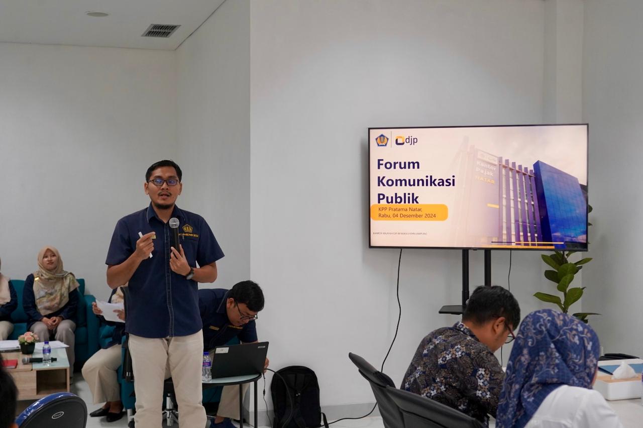 Kantor Pelayanan Pajak (KPP) Pratama Natar mengadakan kegiatan Forum Komunikasi Publik (FKP) bertempat di Ruang Coworking Space KPP Pratama Natar, Jalan Lintas Sumatera KM 29 No 5, Haduyang, Natar, Kabupaten Lampung Selatan (Rabu, 4/12). Kegiatan ini bertujuan untuk mendapatkan umpan balik atas pelayanan yang telah diberikan Direktorat Jenderal Pajak (DJP) dalam penyempurnaan Standar Pelayanan Perpajakan.