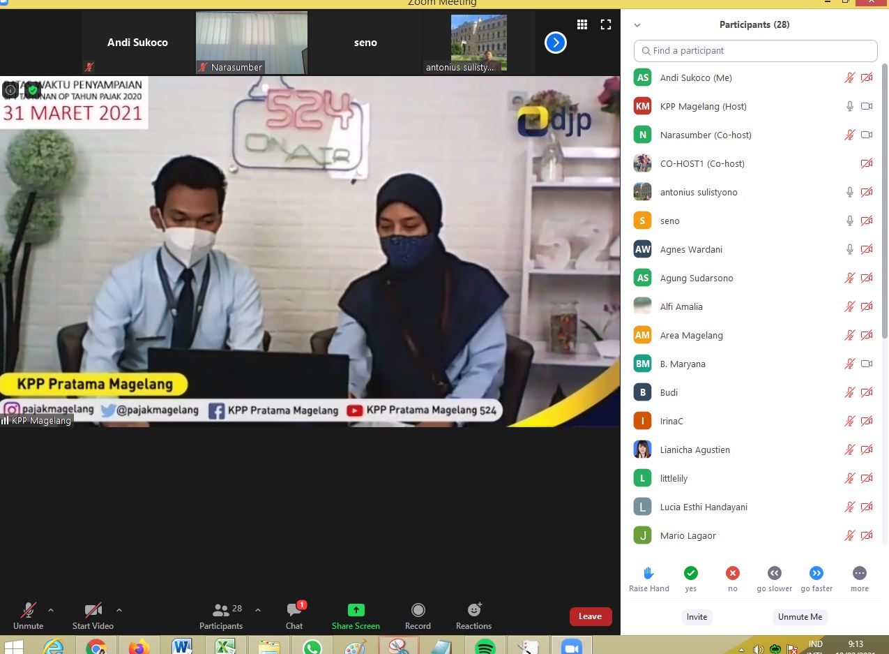 Kantor Pelayanan Pajak (KPP) Pratama Magelang mengadakan kelas pajak daring terkait pengisian Surat Pemberitahuan (SPT) Tahunan PPh Orang Pribadi formulir 1770S dan 1770SS melalui zoom meeting (Rabu, 10/2). KPP Pratama Magelang melaksanakan kegiatan ini di Studio Pajak (Stupa) pada pukul 09.00 s.d 10.30 WIB.