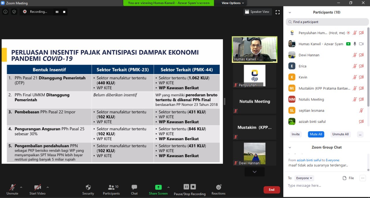 Kanwil DJP Sulawesi Selatan, Barat, dan Tenggara (Sulselbartra) mengadakan Sosialisasi Perpajakan terkait Insentif Pajak yang dikemas dalam acara kelas pajak daring melalui aplikasi Zoom di Makassar (Kamis, 14/5). Kegiatan bertajuk 'Sosialisasi PMK-44/PMK.03/2020 tentang Insentif Pajak untuk Wajib Pajak Terdampak Pandemi Covid-19' ini diikuti oleh Wajib Pajak Orang Pribadi maupun perwakilan Wajib Pajak Badan di wilayah Kota Makassar dan sekitarnya.