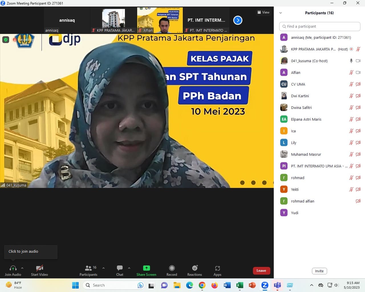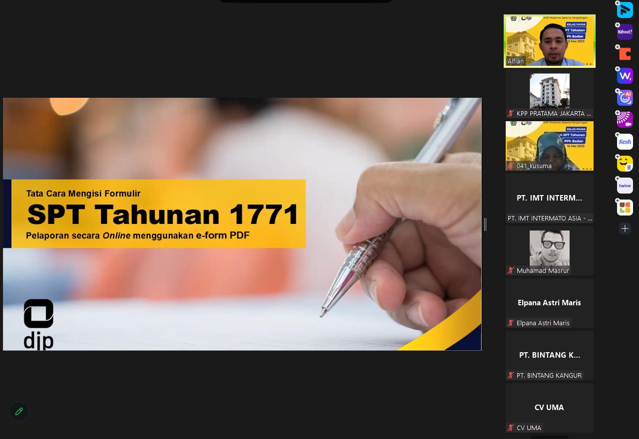 Kantor Pelayanan Pajak (KPP) Pratama Jakarta Penjaringan menyelenggarakan kelas pajak mengenai tata cara pelaporan SPT Tahunan PPh Badan Pengusaha Kena Pajak (PKP) secara online (Rabu, 10/5). Kegiatan dilaksanakan pukul 09.00 sampai 11.00 WIB dengan pemateri Rohmad Zaenal Alfian selaku Fungsional Penyuluh Pajak.