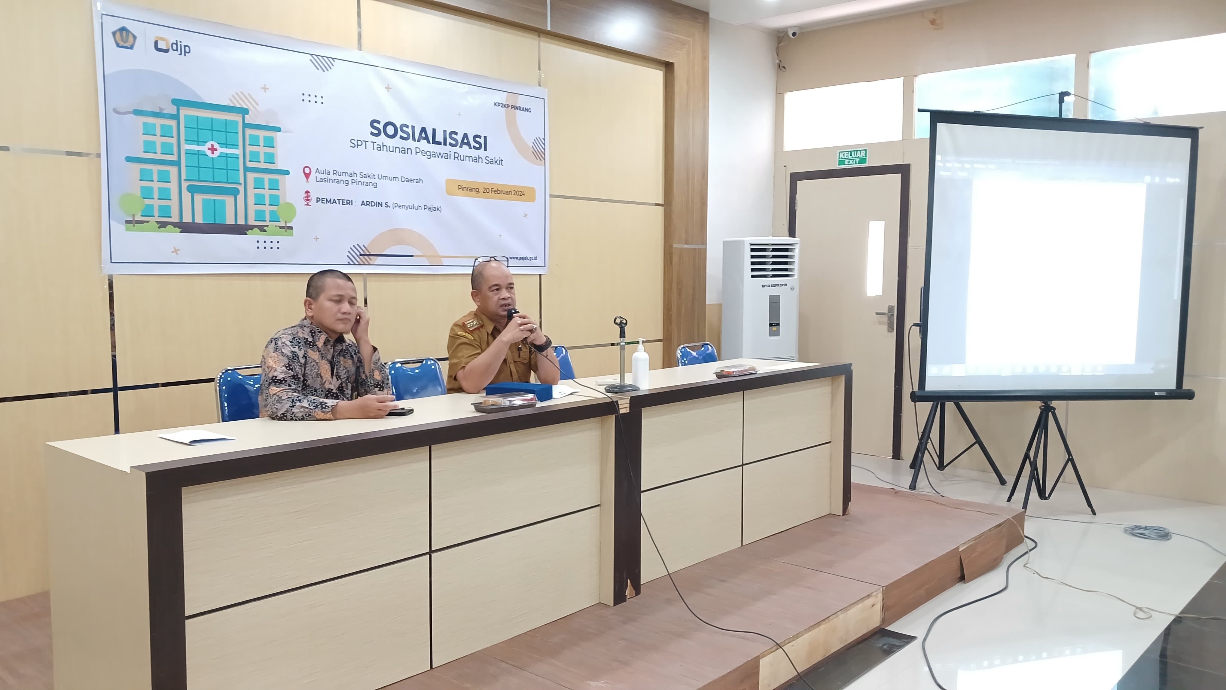 Kantor Pelayanan, Penyuluhan, dan Konsultasi Perpajakan (KP2KP) Pinrang memberikan edukasi perpajakan bagi dokter dan pegawai Rumah Sakit Umum Daerah (RSUD) Lasinrang Pinrang yang beralamat di Jalan Macan, Kelurahan Macorawalie, Kecamatan Watang Sawitto, Kabupaten Pinrang (Selasa,20/2). Edukasi perpajakan kali ini berfokus pada pelaporan Surat Pemberitahuan (SPT) Tahunan bagi dokter dan pegawai RSUD Lasinrang yang bertempat di Aula RSUD Lasinrang Pinrang.