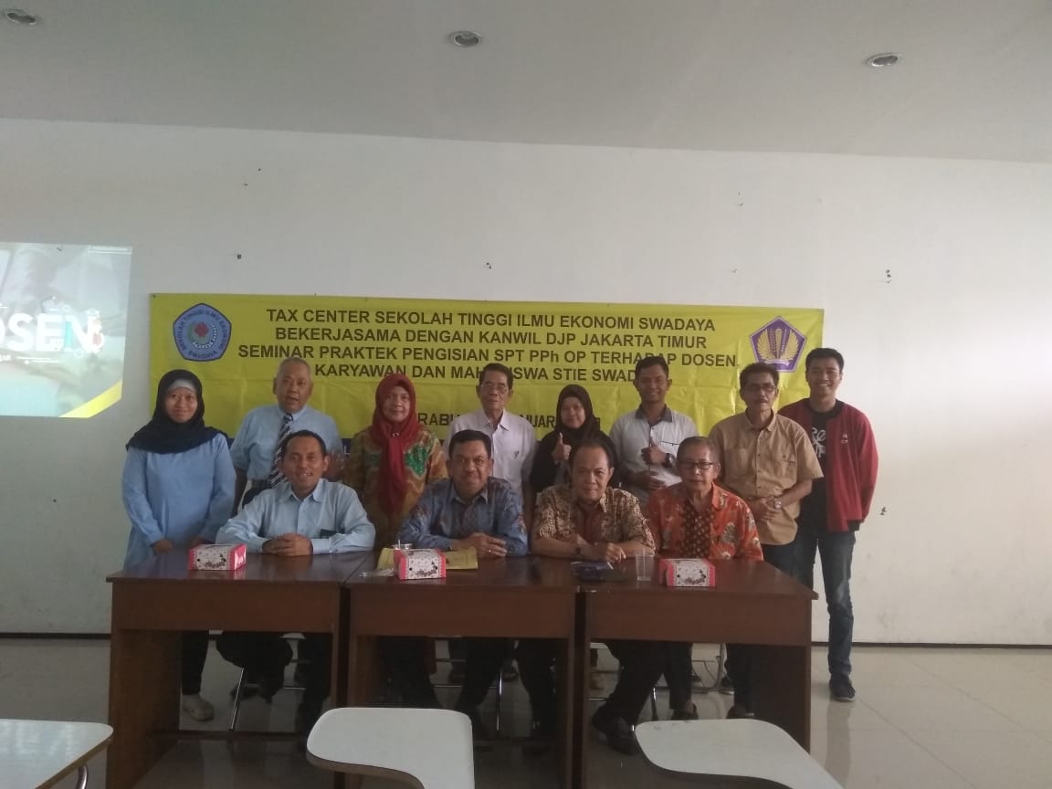 Sekolah Tinggi Ilmu Ekonomi (STIE) Swadaya bekerja sama dengan Kantor Wilayah DJP Jakarta Timur menyelenggarakan sosialisasi perpajakan bagi dosen, karyawan, dan mahasiswa di Aula Kampus STIE Swadaya (Rabu, 29/1).