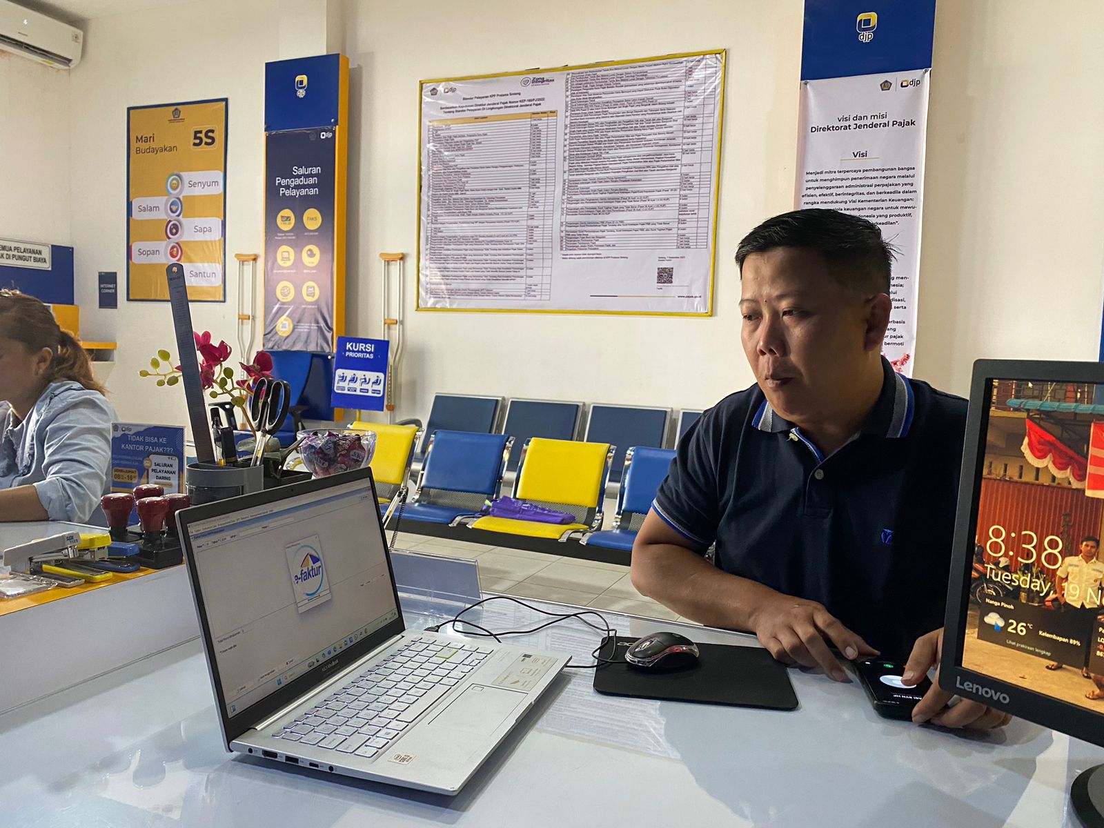 Penyuluh Pajak Nanga Pinoh, Iqbal Pasuja membantu wajib pajak melakukan asistensi pembuatan faktur pajak bersama salah seorang wajib pajak di ruang tempat pelayanan terpadu (TPT) KP2KP Nanga Pinoh (Selasa, 19/11).
