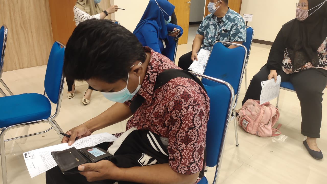 Sebelum menerima vaksinasi, para peserta melakukan registrasi dengan mengisi formulir dan mempersiapkan KTP. Setelah itu, para peserta akan melalui proses skrining kesehatan baru kemudian menerima vaksin dosis pertama yang akan disuntikkan oleh petugas.