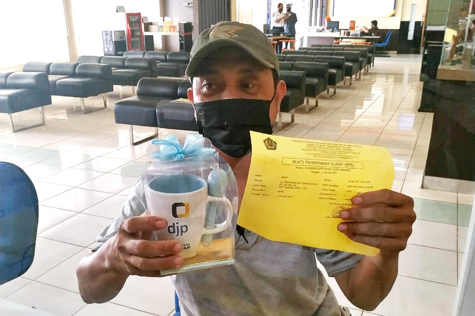 Amir (44) seorang penjual kue pukis dari Kecamatan Cilacap Utara menjadi wajib pajak yang pertama kali lapor SPT Tahunan pajak penghasilan di KPP Pratama Cilacap (Senin, 4/1). Amir datang dan mengisi formulir SPT Tahunan pajak penghasilan orang pribadi dengan lengkap, kemudian menyerahkan formulir tersebut kepada petugas di loket Tempat Pelayanan Terpadu (TPT) KPP Pratama Cilacap. Menurut warga Kelurahan Mertasinga ini, melakukan pelaporan SPT di awal akan membuat dirinya merasa lebih nyaman.
