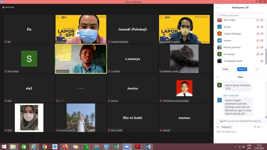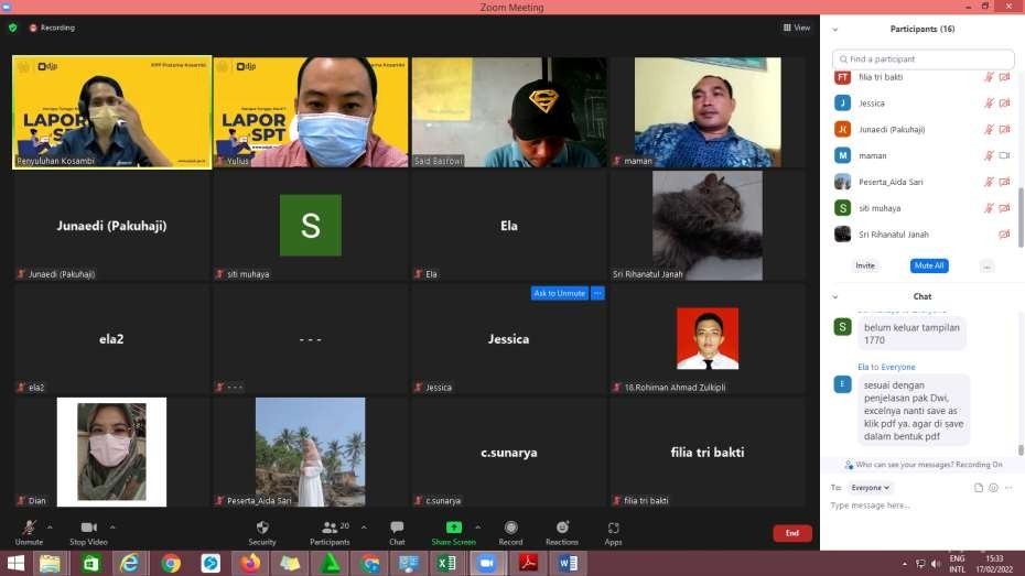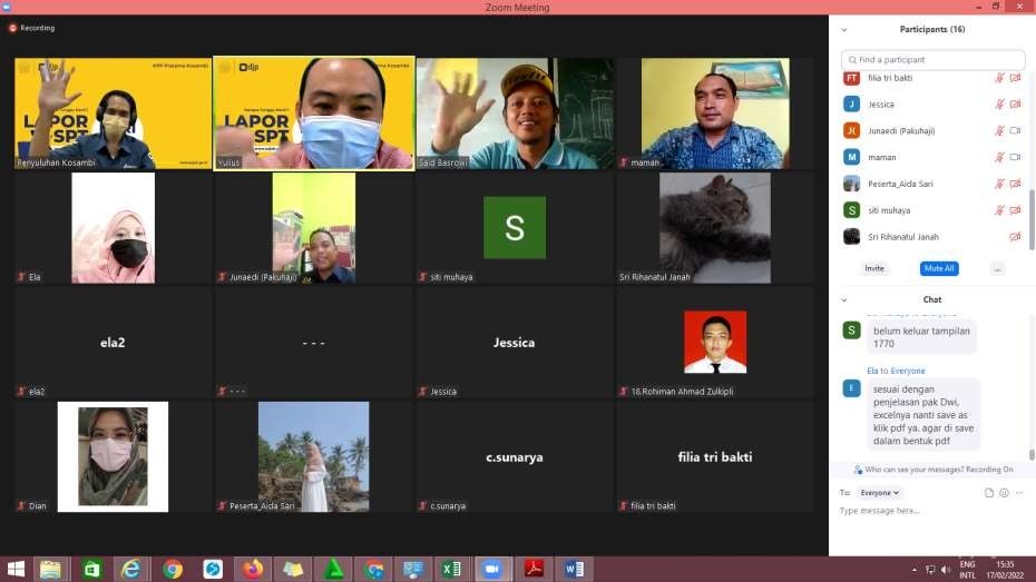 Kegiatan dilaksanakan secara daring melalui aplikasi zoom meeting dan berlangsung mulai pukul 09.00 WIB. Selain penyampaian materi tentang kewajiban pelaporan SPT Tahunan, tim penyuluh selaku narasumber juga mengajak para peserta untuk ikut secara langsung melaporkan SPT Tahunannya.