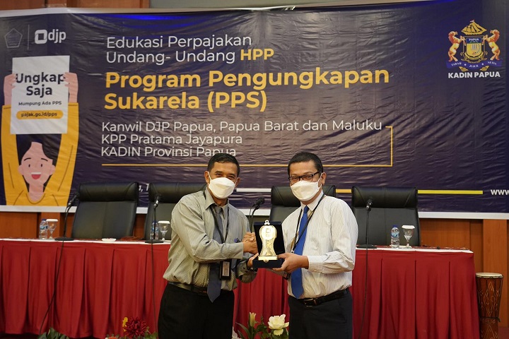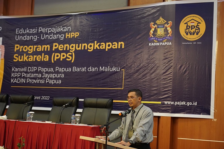 Dalam rangka memberikan pemahaman mengenai Program Pengungkapan Sukarela (PPS), Kantor Wilayah DJP Papua, Papua Barat dan Maluku (Kanwil DJP Papabrama) bersama Kamar Dagang dan Industri (Kadin) Provinsi Papua menyelenggarakan kegiatan sosialisasi Undang-Undang Harmonisasi Peraturan Perpajakan (UU HPP) dan Program Pengungkapan Sukarela di Hotel Horison Kotaraja, Kota Jayapura, Papua (Kamis, 10/3).