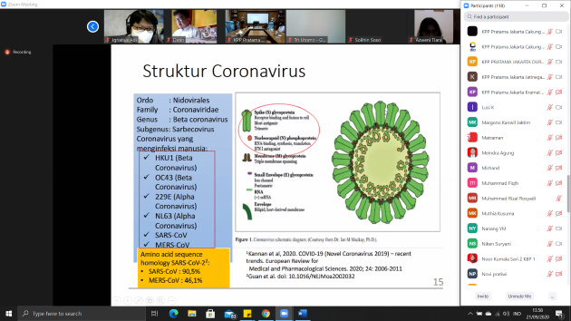 Narasumber pertama dr. Srie Sisca Primarianti, SpPk memaparkan mengenai struktur virus Corona, pilihan metode pemeriksaan pada pandemi Covid-19, dan faktor-faktor yang dapat mempengaruhi hasil pemeriksaan. Struktur virus Corona terdiri dari ordo Nidovirales, family Coronaviridae, genus Beta Coronavirus, dan subgenus Sarbecovirus. Pilihan metode pemeriksaannya ada tiga, yaitu: Rapid Tes Antigen, Rapid Tes Antibodi, dan PCR atau TRM. Faktor-faktor yang dapat mempengaruhi hasil pemeriksaan tersebut antara lain: waktu pengambilan sampel, pemilihan sampel, antigen yang digunakan, waktu pembacaan hasil, dan subjektivitas pembaca hasil.