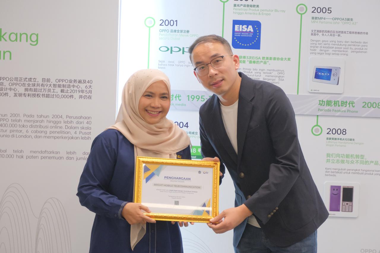 Piagam penghargaan diserahkan langsung oleh Kepala KPP Madya Tangerang. Penghargaan ini diberikan kepada perwakilan pengurus PT Bright Mobile Telecommunication karena telah berkontribusi terhadap pencapaian target penerimaan pajak KPP Madya Tangerang tahun 2023.