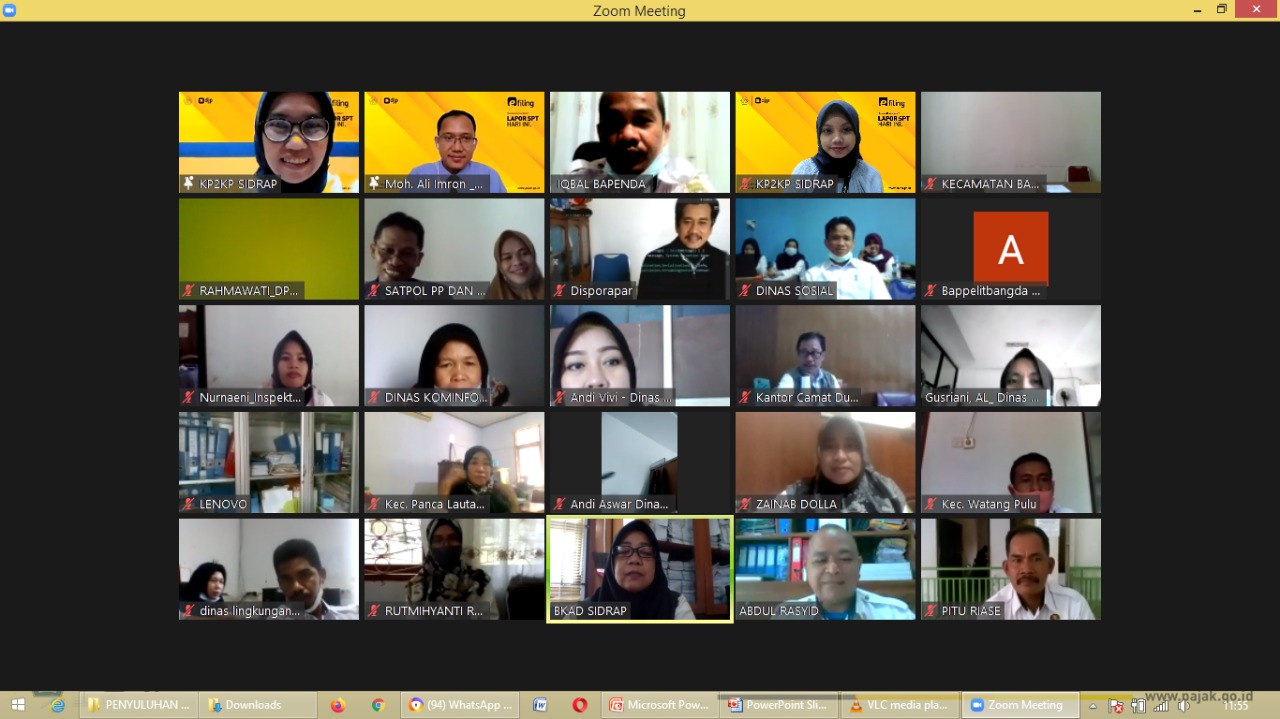 Kantor Pelayanan Penyuluhan dan Konsultasi Perpajakan (KP2KP) Sidrap mengadakan edukasi perpajakan yang diadakan secara daring melalui media Zoom Meeting di Sidrap (Rabu, 3/3). Peserta dalam kegiatan ini adalah Bendahara dan Operator dari berbagai Dinas di lingkungan Satuan Kerja Perangkat Daerah (SKPD) Kabupaten Sidrap serta Bendahara dan Operator dari seluruh Kecamatan di wilayah Kabupaten Sidrap.