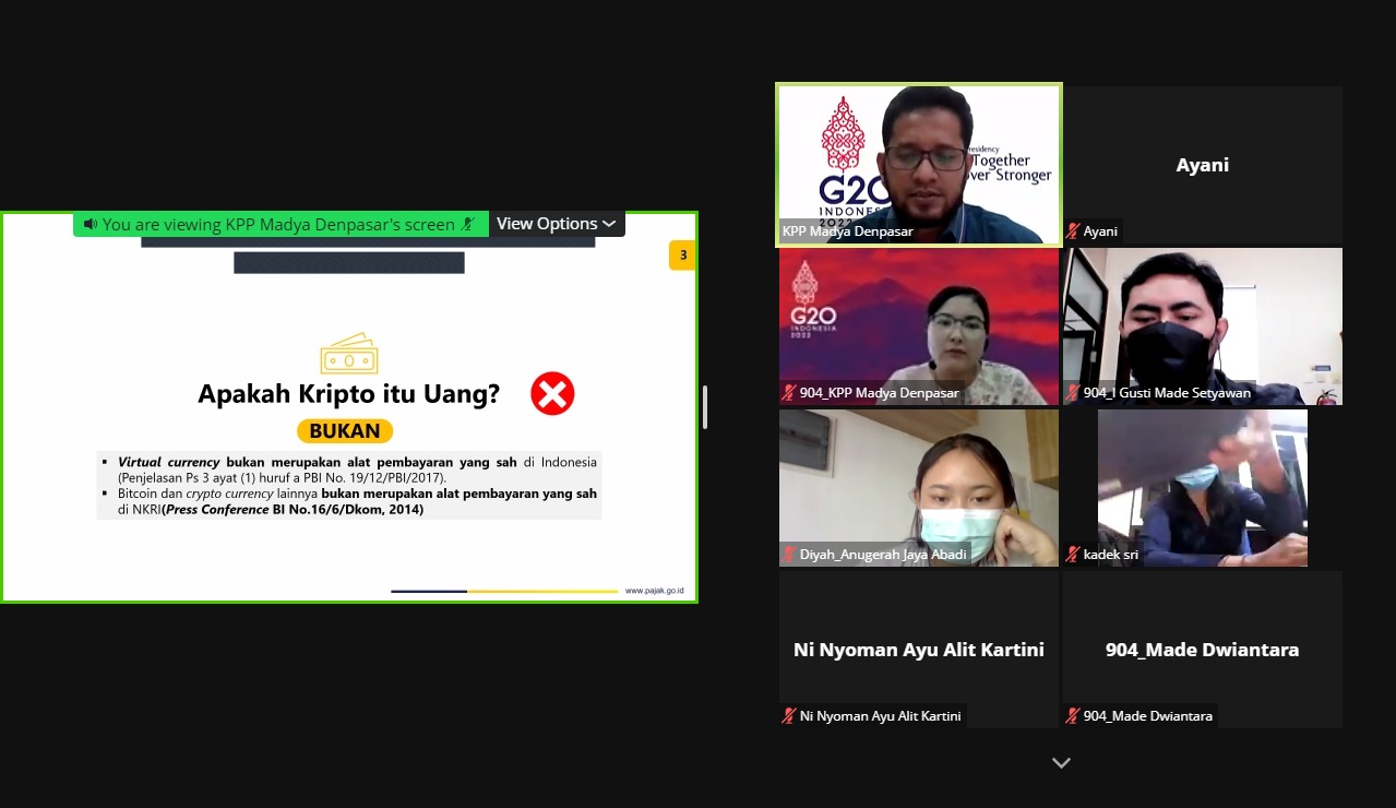 Tim Penyuluh Kantor Pelayanan Pajak (KPP) Madya Denpasar mengadakan edukasi perpajakan yang membahas Peraturan Menteri Keuangan (PMK) nomor 68/PMK.03/2022 tentang Pajak Pertambahan Nilai (PPN) dan Pajak Penghasilan (PPh) atas Transaksi Perdagangan Aset Kripto melalui Zoom Meeting di Denpasar (Kamis, 30/6).