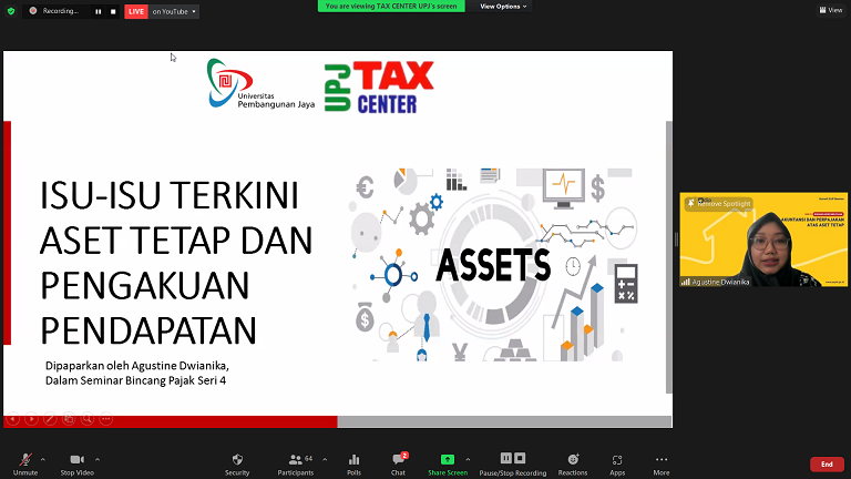 Moderator bincang pajak kali ini adalah mahasiswa semester 7 Fakultas Ekonomi dan Bisnis Politeknik Negeri Jakarta Ratih Putri Andanu. Adapun pemantik diskusi kali ini kepala Tax Center dan pembina relawan pajak Universitas Pembangunan Jaya sekaligus dosen aktif dan praktisi akuntansi pajak Dr. Agustine Dwianika, SE., M.Ak., CMA., CIBA. Agustine membagikan materi isu-isu terkini aset tetap dan pengakuan pendapatan dalam perspektif akuntansi.
