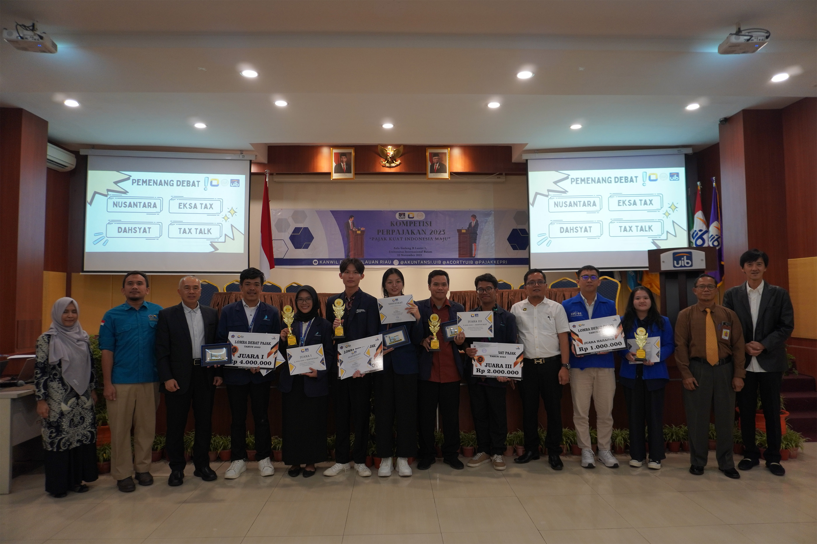 Lomba debat pajak diikuti oleh 20 tim dari berbagai perguruan tinggi di Provinsi Kepri. Tim Politeknik Negeri Batam (Polibatam) berhasil menjadi juara 1 mengalahkan UIB di nomor urut 2 dan tim kedua Polibatam di nomor urut 3. Universitas Universal menjadi juara harapan pada kompetisi debat ini.
