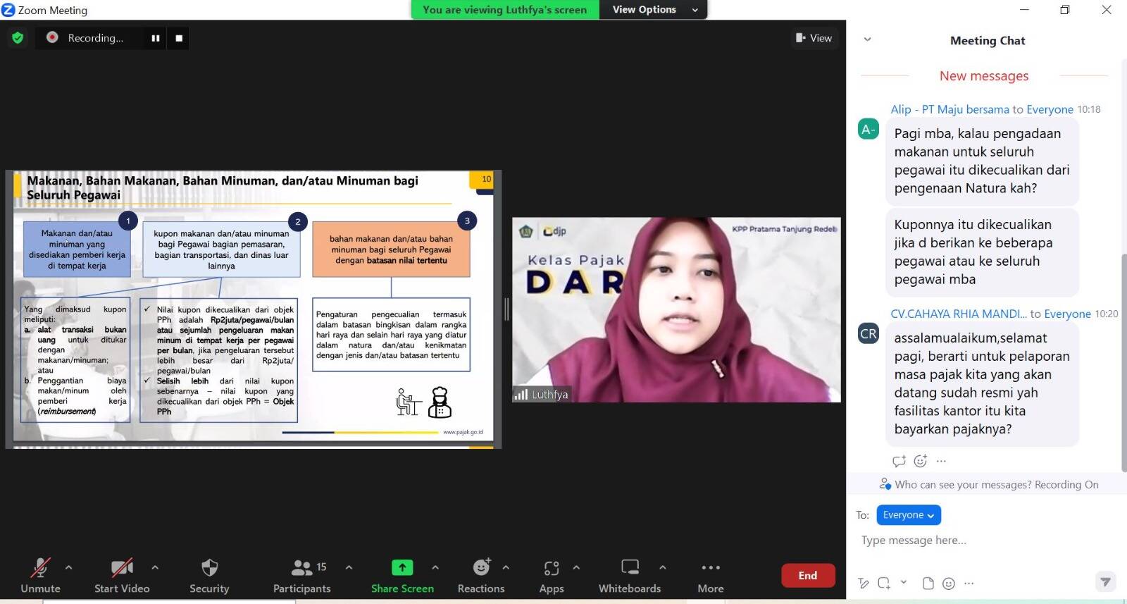 Dalam acara ini, Asisten Penyuluh Pajak KPP Tanjung Redeb Luthfyana Herindawati berperan sebagai pemateri didampingi oleh pelaksana KPP Tanjung Redeb Salsabila Cahyani sebagai pembawa acara. Luthfyana menjelaskan secara detail mengenai perlakuan pajak atas natura/kenikmatan, Peraturan Pemerintah (PP) Nomor 55 tahun 2022, perlakuan pembebanan biaya natura dan natura sebagai objek pajak penghasilan, natura/kenikmatan yang dikecualikan dari objek pajak penghasilan, dan tata cara penilaian dan penghitungan natura/kenikmatan.