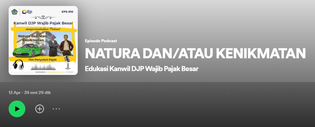 Penyuluh Pajak Kantor Wilayah Direktorat Jenderal Pajak (Kanwil DJP) Wajib Pajak Besar unggah siniar berformat audio yang bisa dinikmati melalui aplikasi Spotify (Kamis, 13/4). Siniar kali ini membahas tema yang sangat menarik, yaitu natura dan/atau kenikmatan yang dikecualikan sebagai Objek Pajak Penghasilan (PPh) berdasarkan Undang-Undang Nomor 7 Tahun 2021 tentang Harmonisasi Peraturan Perpajakan (UU HPP) dan Peraturan Pemerintah Nomor 55 Tahun 2022 tentang Penyesuaian Pengaturan di Bidang Pajak Penghasilan, Jakarta.