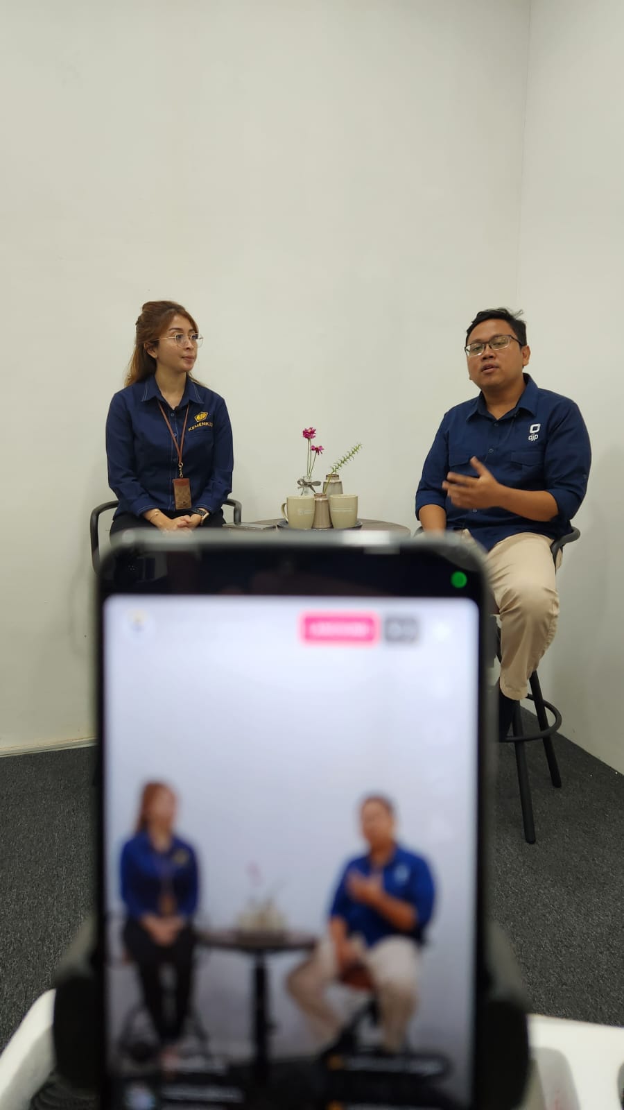 Penyuluh Pajak Charizma Azry Topaz dan Marcellinus Paskaris Wibowo menjelaskan info perpajakan dengan mengemasnya dalam bentuk bincang sore.