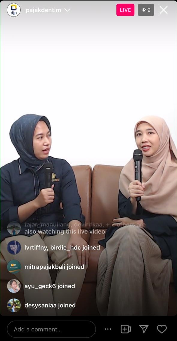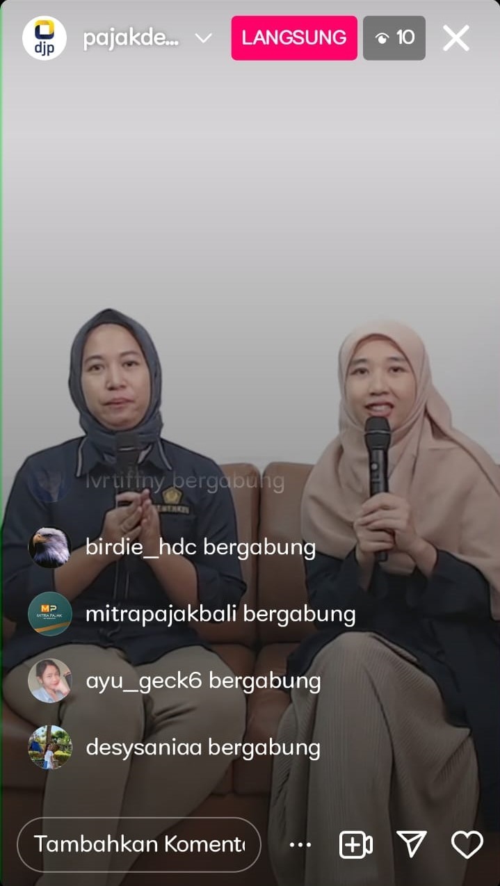 Sebanyak sepuluh peserta turut berpartisipasi dalam kegiatan Instagram Live yang dipandu langsung oleh Asisten Penyuluh Pajak KPP Pratama Denpasar Timur Windy Widiastuty selaku host dan Annisa Fadyah Elhaq selaku narasumber.