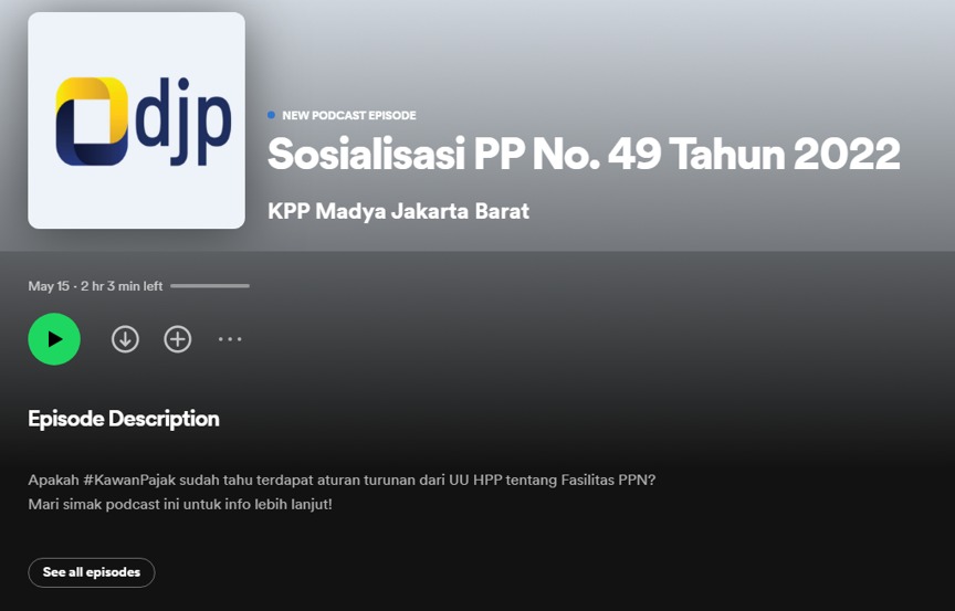 Zawawi berharap melalui siniar ini, wajib pajak dapat mengetahui aturan terbaru mengenai fasilitas PPN sesuai UU HPP. Siniar dapat didengarkan melalui platform Spotify miliki KPP Madya Jakarta Barat.