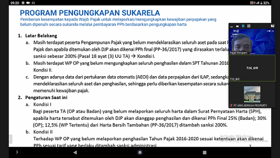 Kantor Pelayanan, Penyuluhan, dan Konsultasi Perpajakan (KP2KP) Tanah Grogot mengadakan Kelas Pajak Program Pengungkapan Sukarela (PPS) secara daring melalui aplikasi Zoom Meeting di ruang Aula KP2KP Tanah Grogot (Jumat, 28/1).