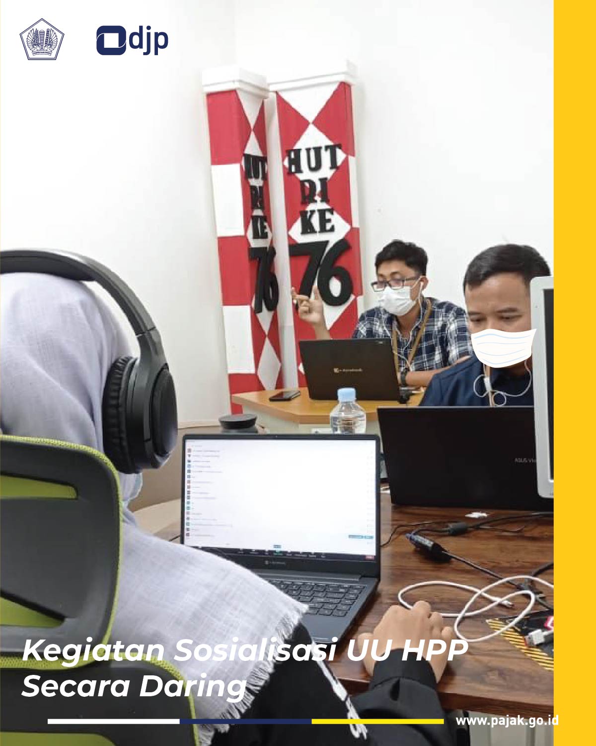 Kantor Pelayanan Pajak (KPP) Madya Bandar Lampung menyelenggarakan kegiatan sosialisasi Undang-Undang Harmonisasi Peraturan Perpajakan (UU HPP) secara daring di Ruang Studio Penyuluh KPP Madya Bandar Lampung, Kota Bandar Lampung (Kamis 09/12).