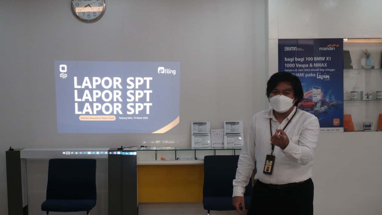 Kantor Pelayanan Penyuluhan nan Konsultasi Perpajakan (KP2KP) Tanjung Selor melakukan jemput bola dengan mengadakan asistensi pelaporan Surat Pemberitahuan (SPT) Tahunan Orang Pribadi kepada para pegawai di Bank Mandiri KCP Tanjung Selor, Kab. Bulungan (Senin, 21/3).