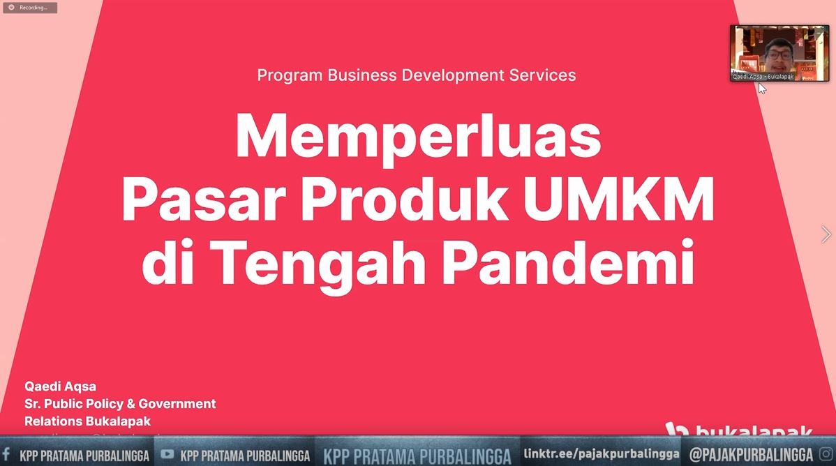 KPP Pratama Purbalingga menyelenggarakan kegiatan Business Development Service (BDS) yang dilaksanakan secara daring melalui Zoom Meeting di Purbalingga (Selasa, 25/8). Kegiatan yang berlangsung selama tiga jam ini menghadirkan dua narasumber utama dengan tema “Memperluas Pasar Produk UMKM di Tengah Pandemi” secara daring (online) melalui Bukalapak dan luring (offline) melalui Alfamart.
