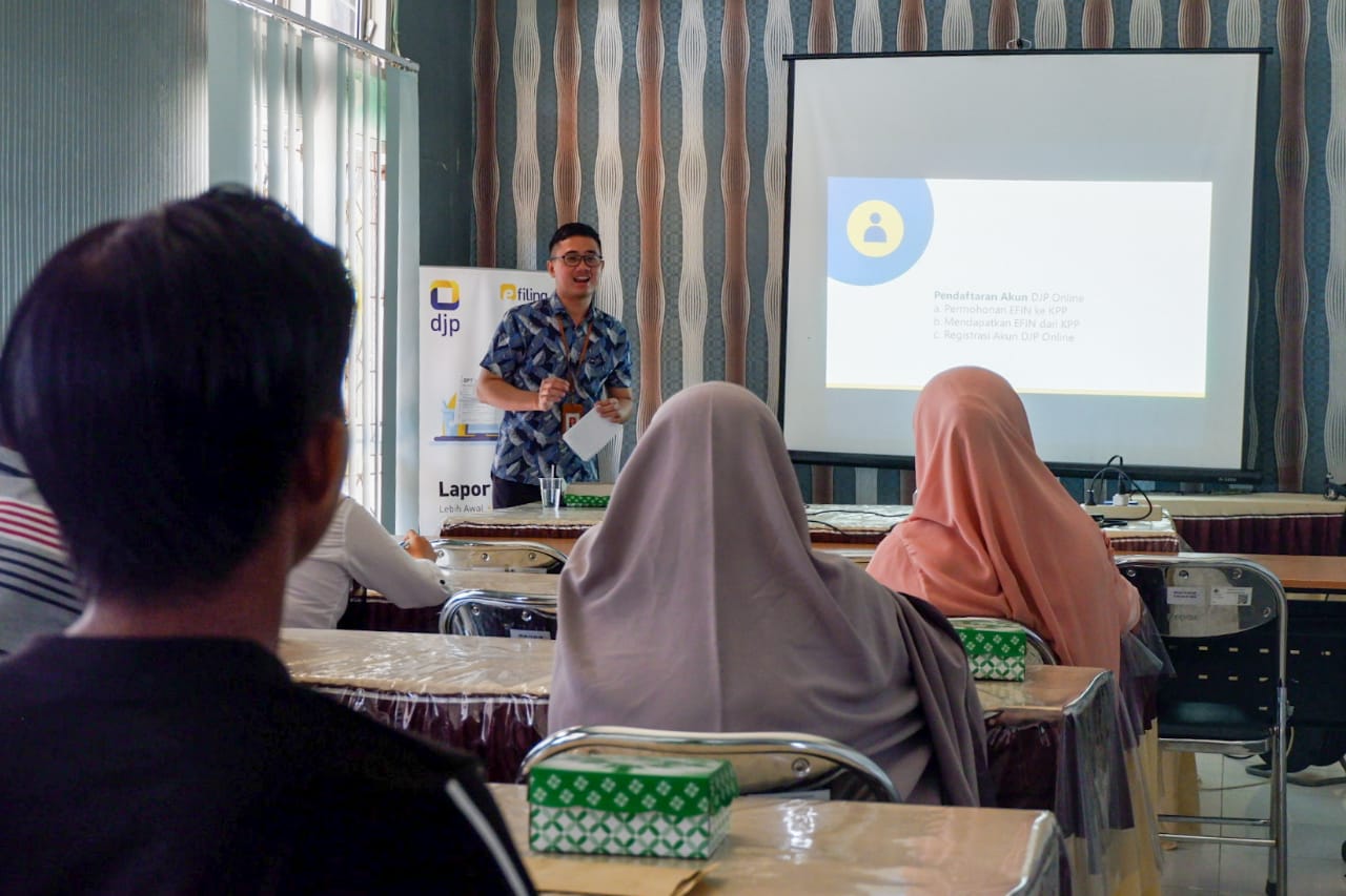 Pemateri KP2KP Tilamuta adalah Bayu Anggala Putra yang akrab di panggil Angga, pelaksana KP2KP Tilamut. Angga menyampaikan tahap demi tahap dalam melakukan Pelaporan SPT Tahunan 2019 secara daring dimulai dari pembuatan akun DJP Online sampai dengan pengisian data-data serta omzet yang diperoleh wajib pajak.