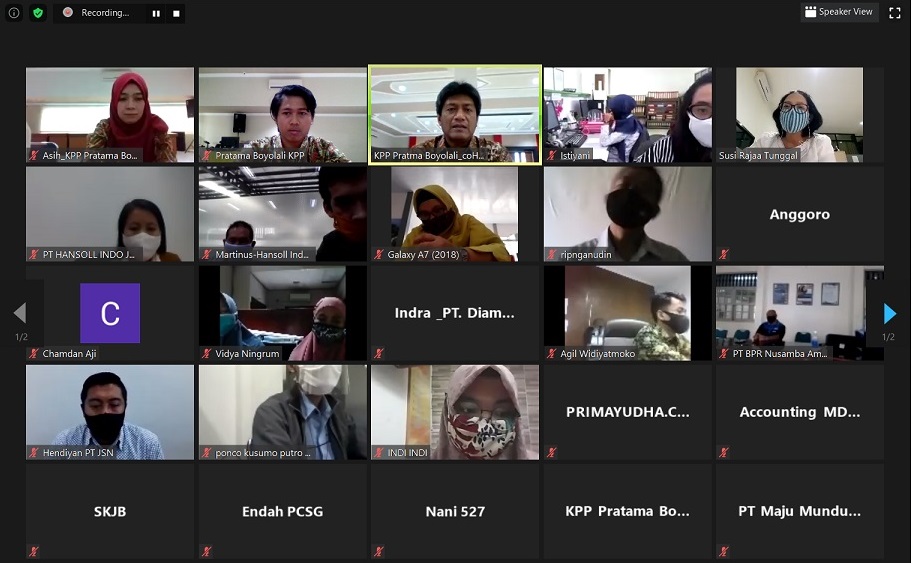 KPP Pratama Boyolali mengadakan kelas pajak secara daring kepada 45 wajib pajak dengan menggunakan aplikasi Zoom Meeting di tempat masing-masing (Selasa, 4/8). Tema yang diusung kali ini adalah Edukasi Perpajakan “e-Bupot PPh Pasal 23/26” yang mulai diimplementasikan secara nasional pada bulan Agustus tahun ini. Kegiatan ini berlangsung dari pukul 10.00 s.d. 12.00 dibuka dengan sambutan Kepala KPP Pratama Boyolali. Bertindak selaku pemateri adalah Sriyatiningsih dan Supatmi yang merupakan Account Representative KPP Pratama Boyolali.