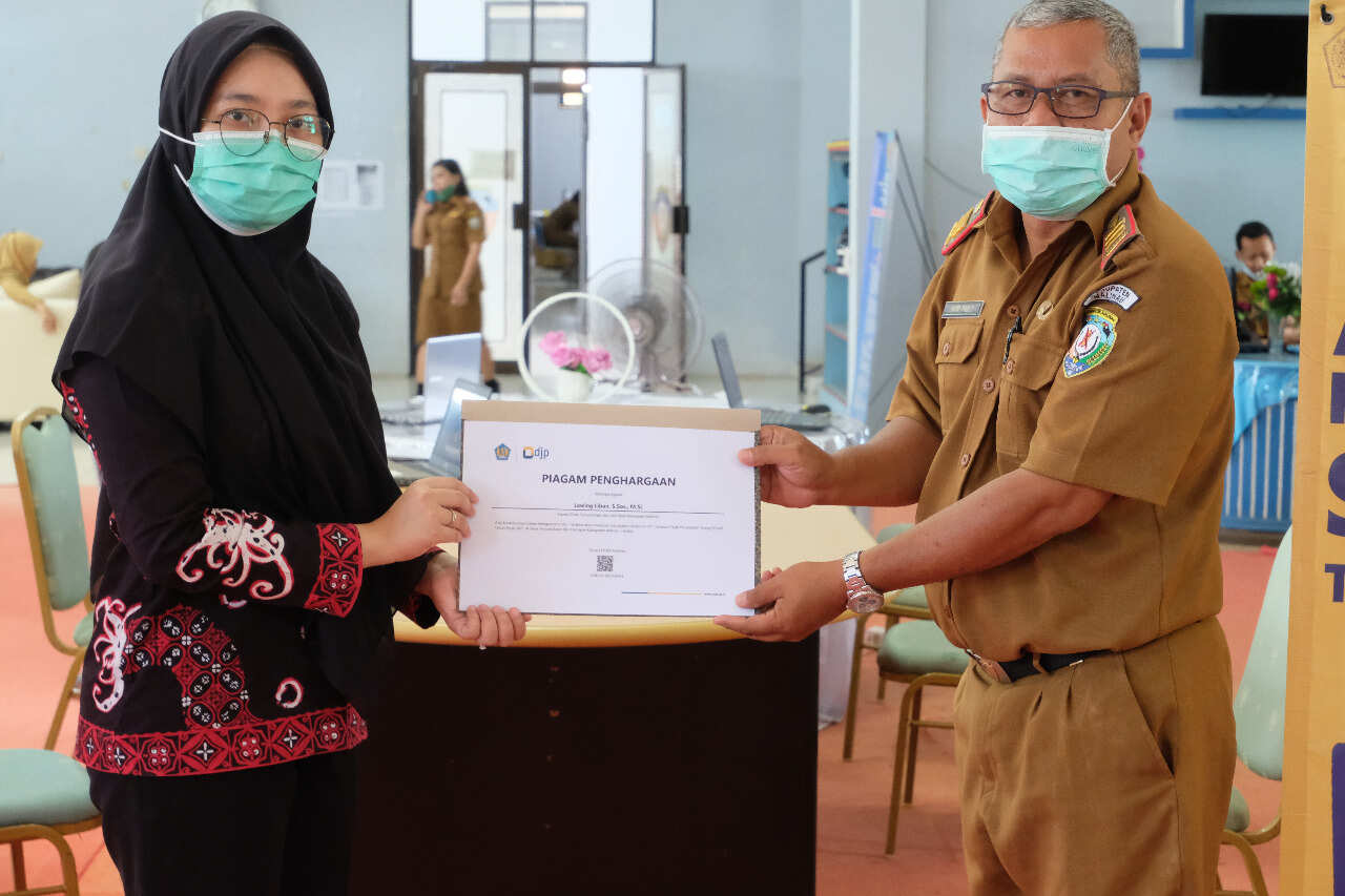 Di akhir kegiatan, Yuliawati Arieyanto Putri, pelaksana KP2KP Malinau memberikan piagam apresiasi kepada Dinas Perpustakaan Kabupaten Malinau atas pencapaian 100% lapor SPT Tahunan.