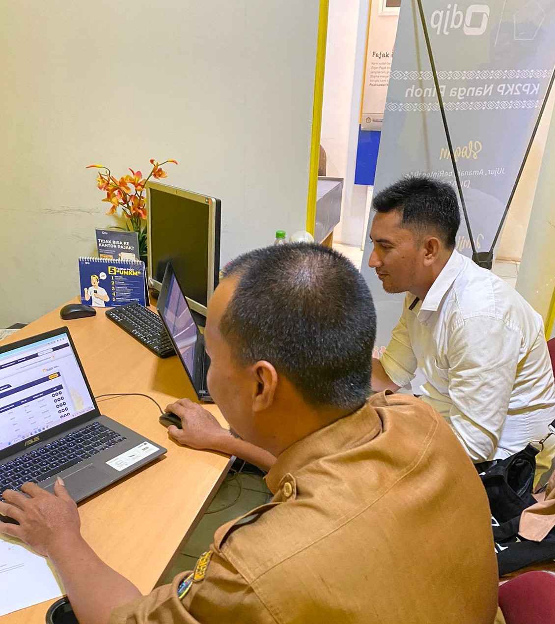 Wajib Pajak Bendahara Desa Kabupaten Melawi melakukan konsultasi terkait pelaporan pajak bukti potong elektronik (e-Bupot) pajak penghasilan PPh 21 bersama dengan Petugas Penyuluh Kantor Pelayanan, Penyuluhan, dan Konsultasi Perpajakan (KP2KP) Nanga Pinoh di ruang konsultasi KP2KP Nanga Pinoh, Kabupaten Melawi (Senin, 10/7). Kemudian beliau mempekenalkan diri sembari mempersiapkan laptop, slip gaji pegawai, dan bukti pembayaran pajak.