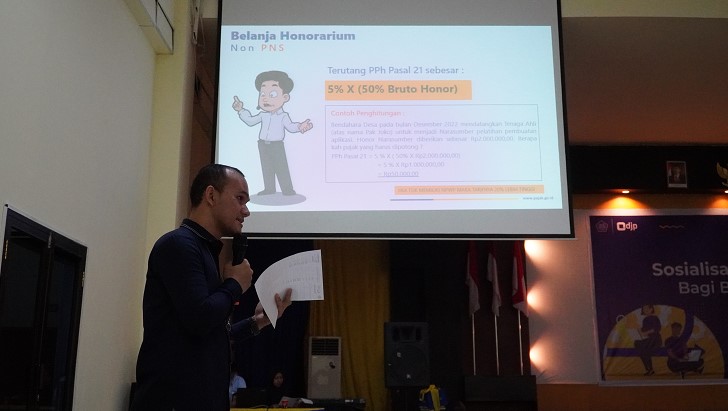 Tim Penyuluh KPP Pratama Sumbawa Besar, yakni Didta Baladil Amin, Rizal Muhaimin, I Putu Arya, dan Herdiyan Wahyu Ikhsan menjelaskan aspek perpajakan bagi Bendahara Desa dan praktik tata cara pelaporan menggunakan SPT Unifikasi. Selain itu, Tim Penyuluh KPP Pratama Sumbawa Besar kembali mengingatkan terkait aturan perpajakan dan pengenaan tarif yang harus dipotong/dipungut oleh bendahara desa.