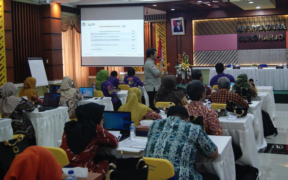 Kantor Pelayanan Pajak (KPP) Pratama Sukoharjo menyelenggarakan sosialisasi Peraturan Menteri Keuangan Nomor 59/PMK.03/2022 (PMK-59/2022) kepada 28 Organisasi Perangkat Daerah (OPD) Kabupaten Wonogiri (Rabu, 6/10) dan 23 Kecamatan se-Kabupaten Wonogiri (Kamis, 7/10). Berkolaborasi dengan Badan Pengelolaan Keuangan Daerah (BPKD) Kabupaten Wonogiri, kegiatan ini digelar di aula KPP Pratama Sukoharjo.