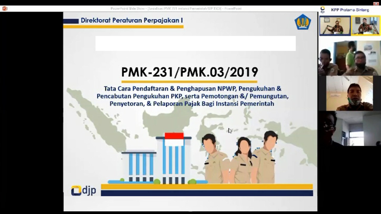 Kantor Pelayanan Pajak (KPP) Pratama Sintang mengadakan sosialisasi secara webinar dengan tema "Administrasi Perpajakan Bagi Instansi Pemerintah PMK Nomor 231/PMK.03/2019" menggunakan media Zoom Meeting di ruang Rapat KPP Pratama Sintang. Sekitar 100 peserta dari Bendahara Instansi Pemerintah di lingkup wilayah kerja Kabupaten Sintang, Melawi, serta Kapuas Hulu mengikuti kegiatan ini (Selasa, 15/9).