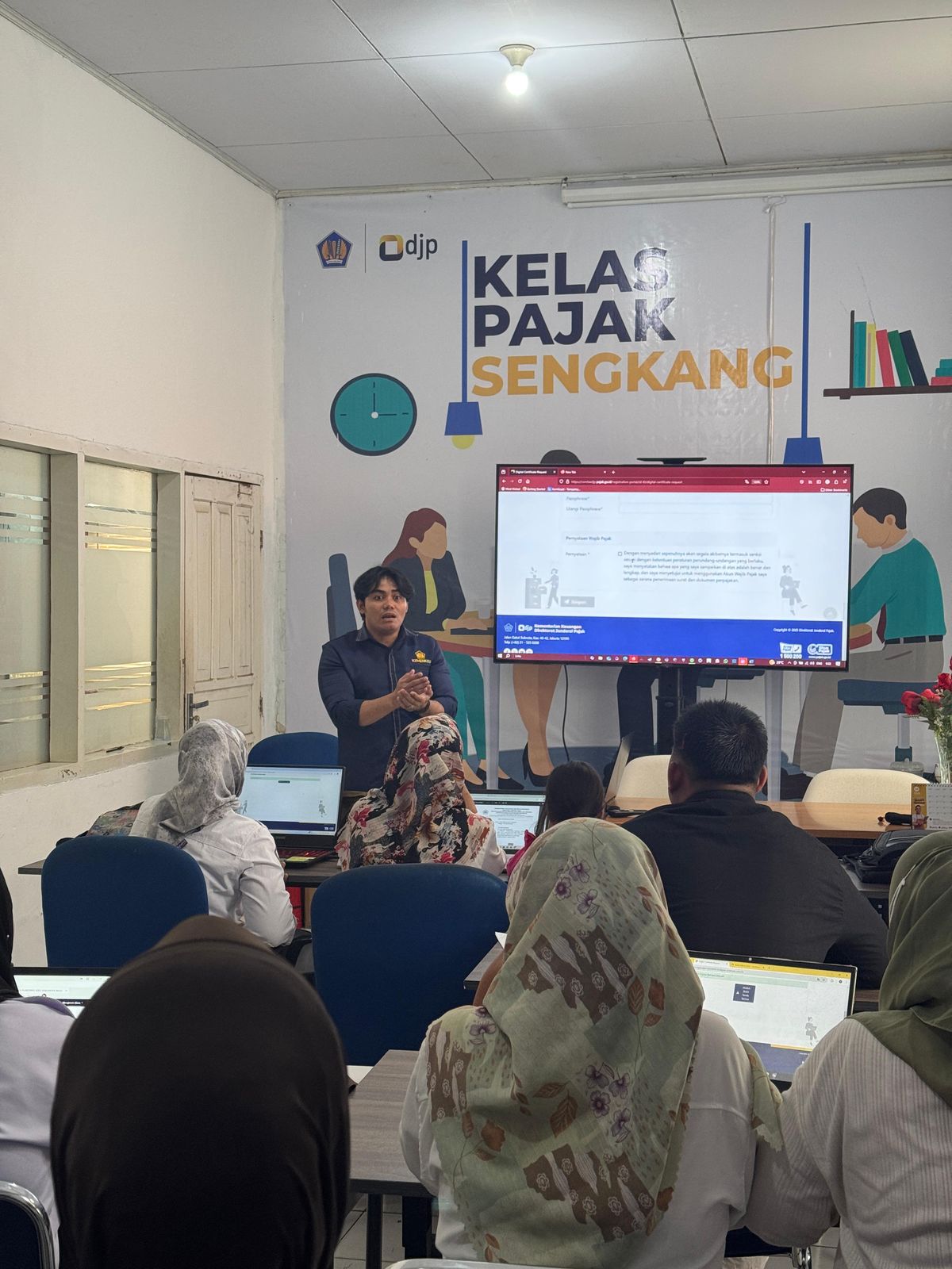 Muh. Hilal Farohi, Petugas KP2KP Sengkang, mempersiapkan kelas pajak dan mempersilakan kepada para bendahara untuk menuju Ruang Kelas Pajak KP2KP Sengkang.