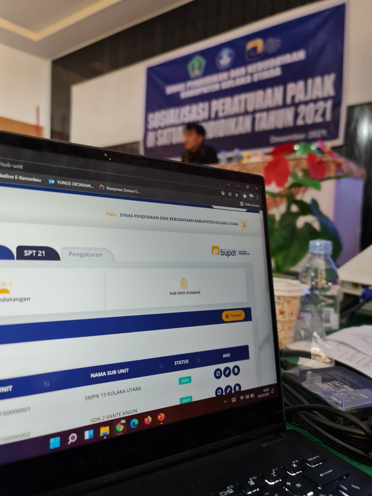 Kantor Pelayanan, Penyuluhan dan Konsultasi Perpajakan (KP2KP) Lasusua bekerja sama dengan Dinas Pendidikan dan Kebudayaan Kolaka Utara menyelenggarakan kegiatan Bimbingan Teknis (Bimtek) e-Bupot SPT Masa Unifikasi (Sabtu, 18/12). Bimtek yang diikuti oleh Bendahara Sekolah Dasar (SD) dan Sekolah Menengah Pertama (SMP) se-Kabupaten Kolaka Utara ini diselenggarakan secara tatap muka di ruang aula Hotel Utama, Kabupaten Kolaka Utara.
