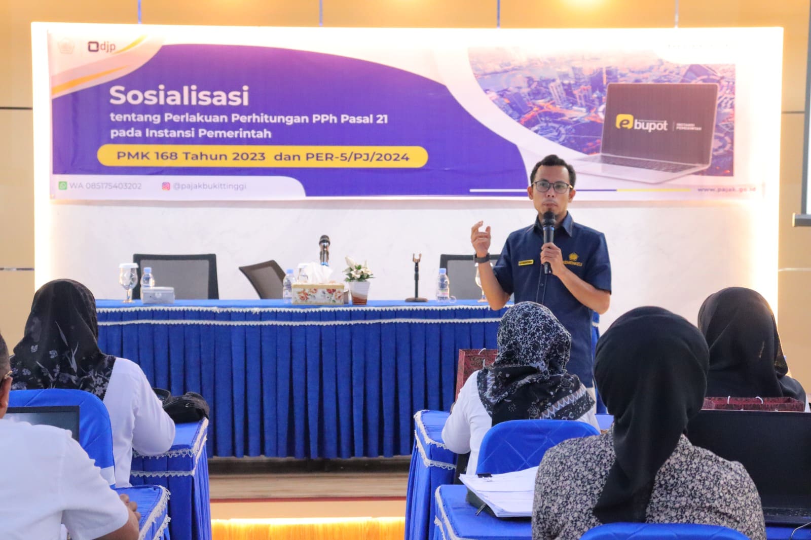 Kantor Pelayanan Pajak (KPP) Pratama Bukittinggi melakukan sosialisasi tentang perlakuan penghitungan PPh Pasal 21 pada Instansi Pemerintah Kabupaten Pasaman. Kegiatan diadakan di Aula KPP Pratama Bukittinggi (Rabu, 31/7).