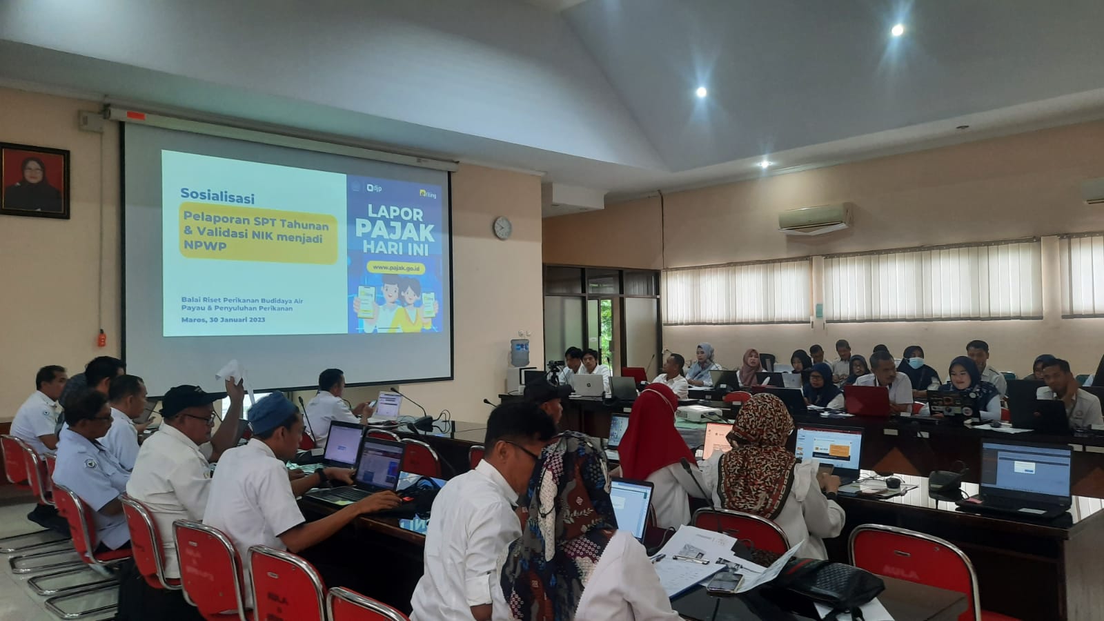Kantor Pelayanan Pajak (KPP) Pratama Maros menyelenggarakan kegiatan sosialisasi perpajakan di Balai Riset Perikanan Budidaya Air Payau dan Penyuluhan Perikanan, Kabupaten Maros. Kegiatan ini dilakukan secara hybrid dari Aula Fuad Cholid Kabupaten Maros (Senin, 30/1). Sosialisasi perpajakan ini meliputi pemadanan Nomor Induk Kependudukan (NIK) sebagai Nomor Pokok Wajib Pajak (NPWP) sekaligus pelaporan Surat Pemberitahuan (SPT) Tahunan karyawan.