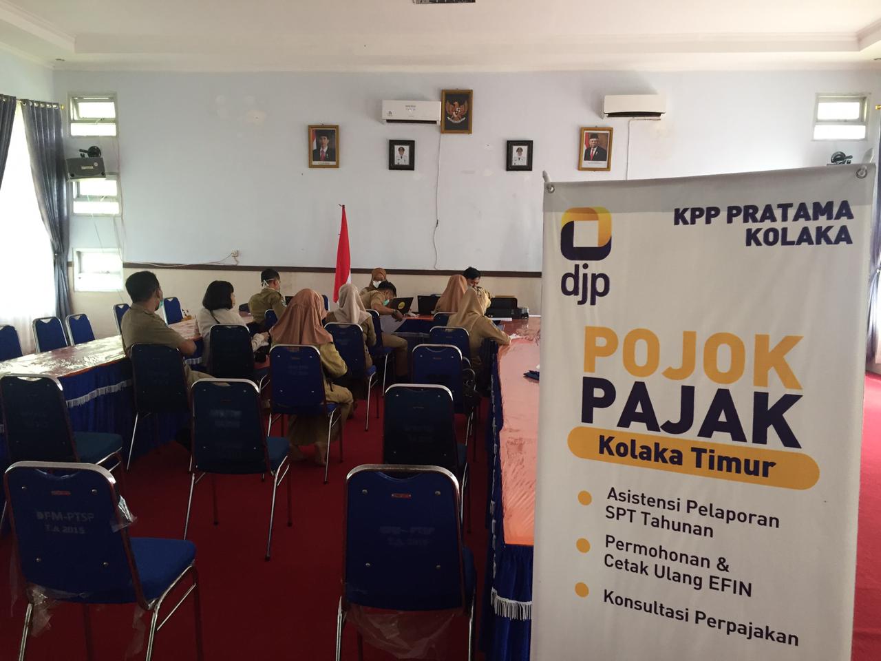 Kantor Pelayanan Pajak (KPP) Pratama Kolaka membuka layanan Pojok Pajak di Aula Dinas Penanaman Modal dan Pelayanan Terpadu Satu Pintu (DPMPTSP) Kabupaten Kolaka Timur (Senin, 1/3). Pojok Pajak ini melayani konsultasi pelaporan SPT Tahunan Wajib Pajak Orang Pribadi dan layanan permohonan lupa EFIN.