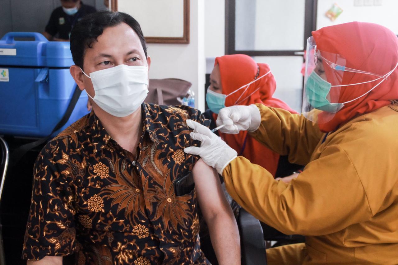 Kepala Kantor Pelayanan Pajak (KPP) Pandeglang Ismail dan para pegawai menerima vaksinasi Covid-19 tahap pertama yang diselenggarakan di Dinas Kesehatan Kabupaten Pandeglang, Pandeglang (Selasa, 2/3).