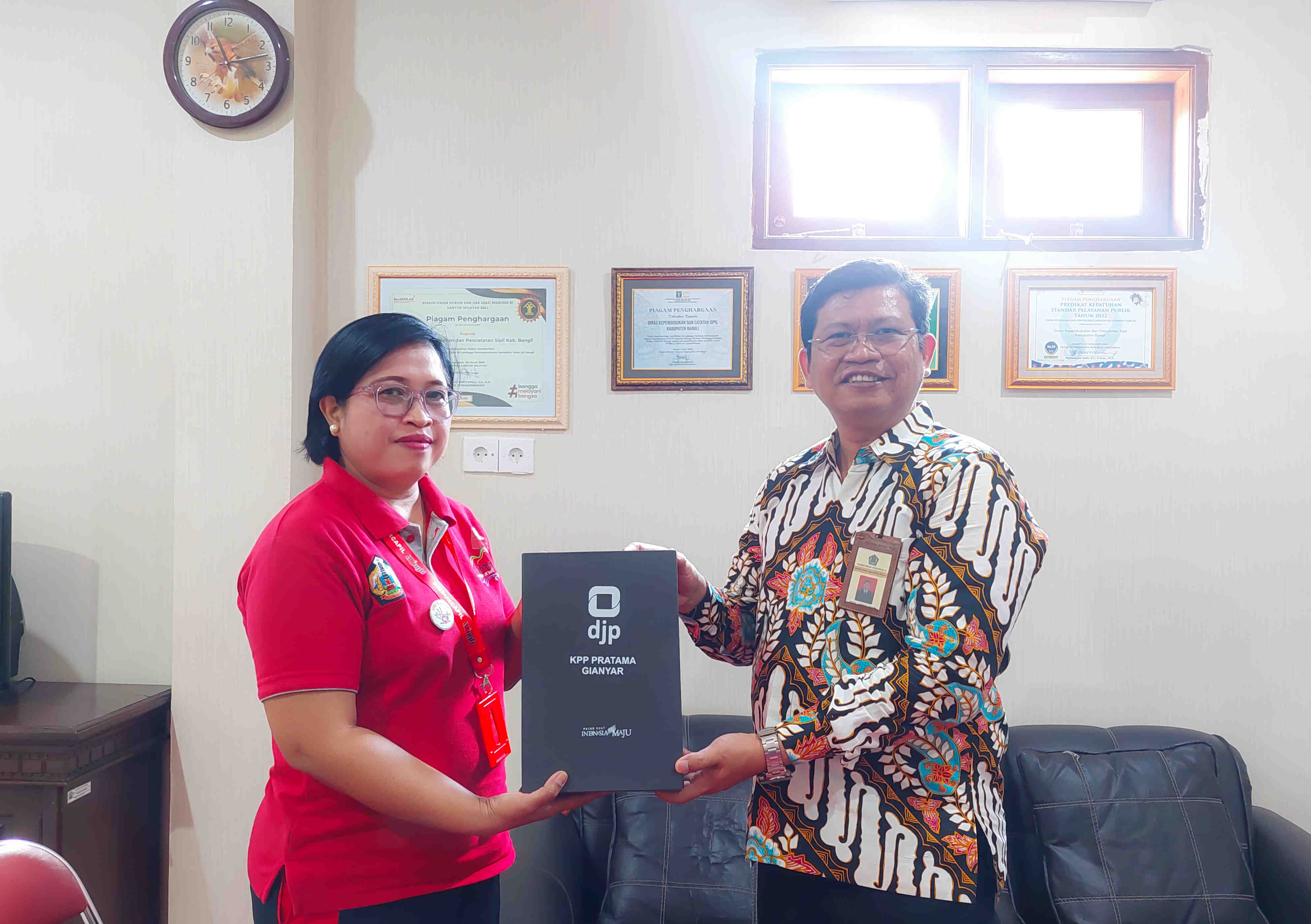 Kepala Kantor Pelayanan Pajak (KPP) Pratama Gianyar berkunjung ke instansi/Organisasi Perangkat Daerah (OPD) di wilayah Kabupaten Bangli (Jumat, 1/9). Kegiatan kunjungan ini dilakukan dalam rangka memberikan apresiasi kepada Instansi/OPD yang seluruh pegawainya telah melaporkan SPT Tahunan tepat waktu dan tercepat sehingga diberikan gelar Duta e-Filing.